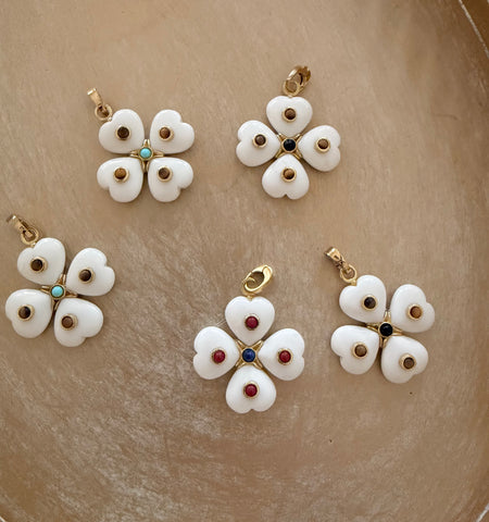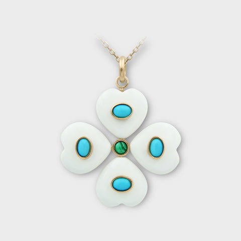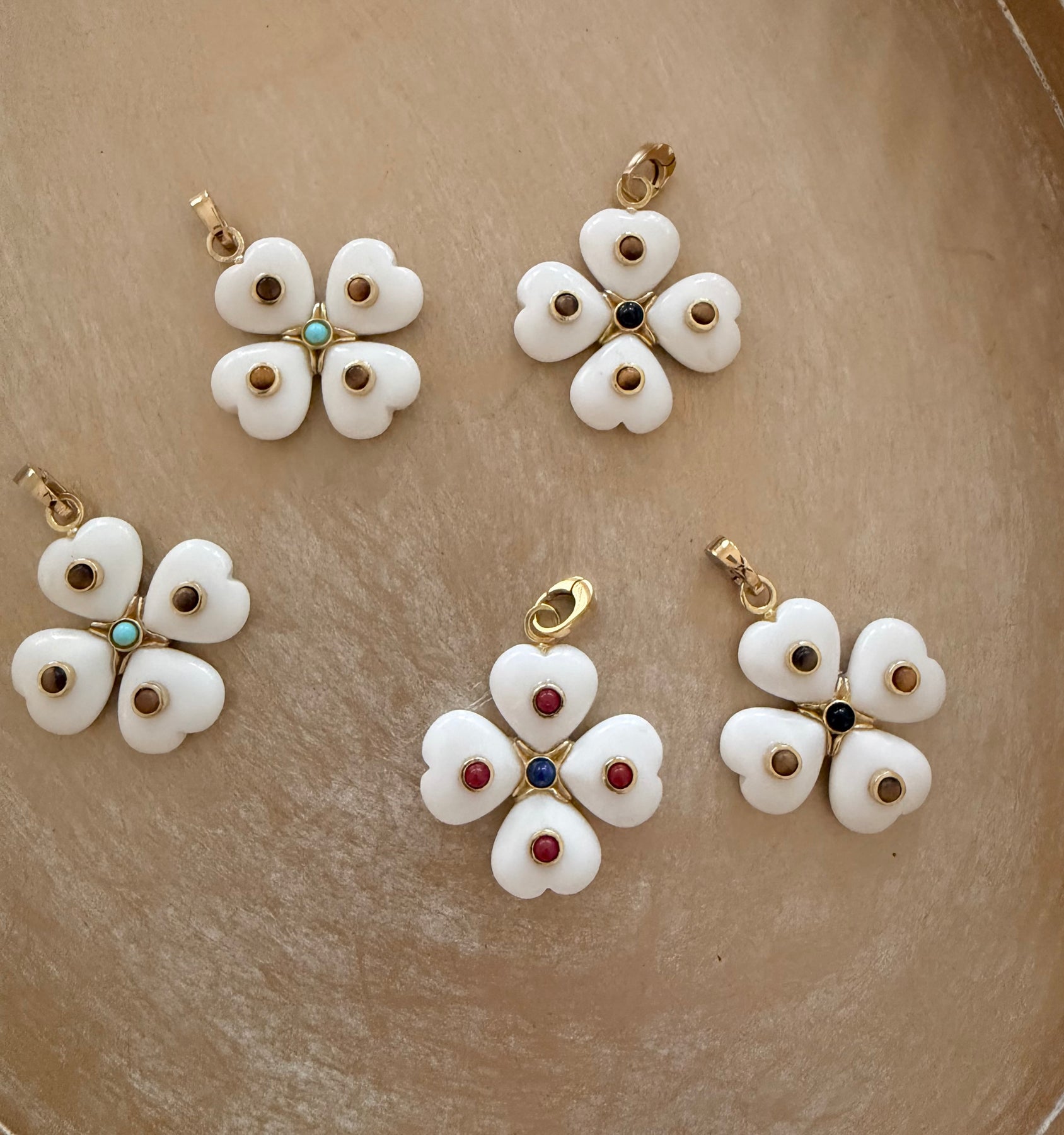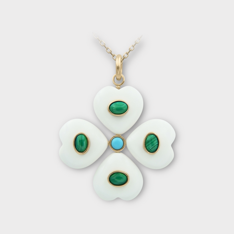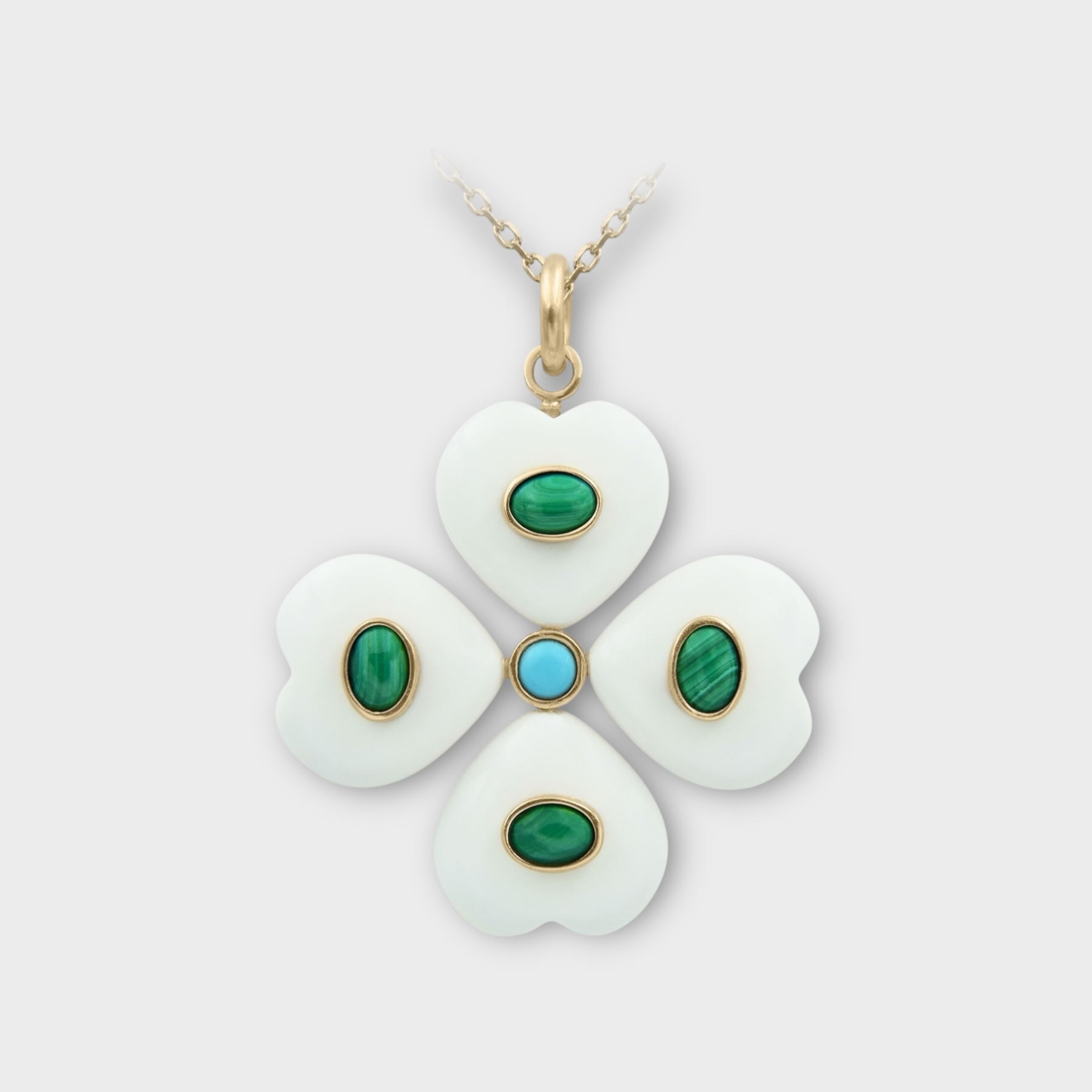 A clean clover pendant formed by four custom white heart petals. Graphic, balanced, and designed for everyday wear—alone or layered.