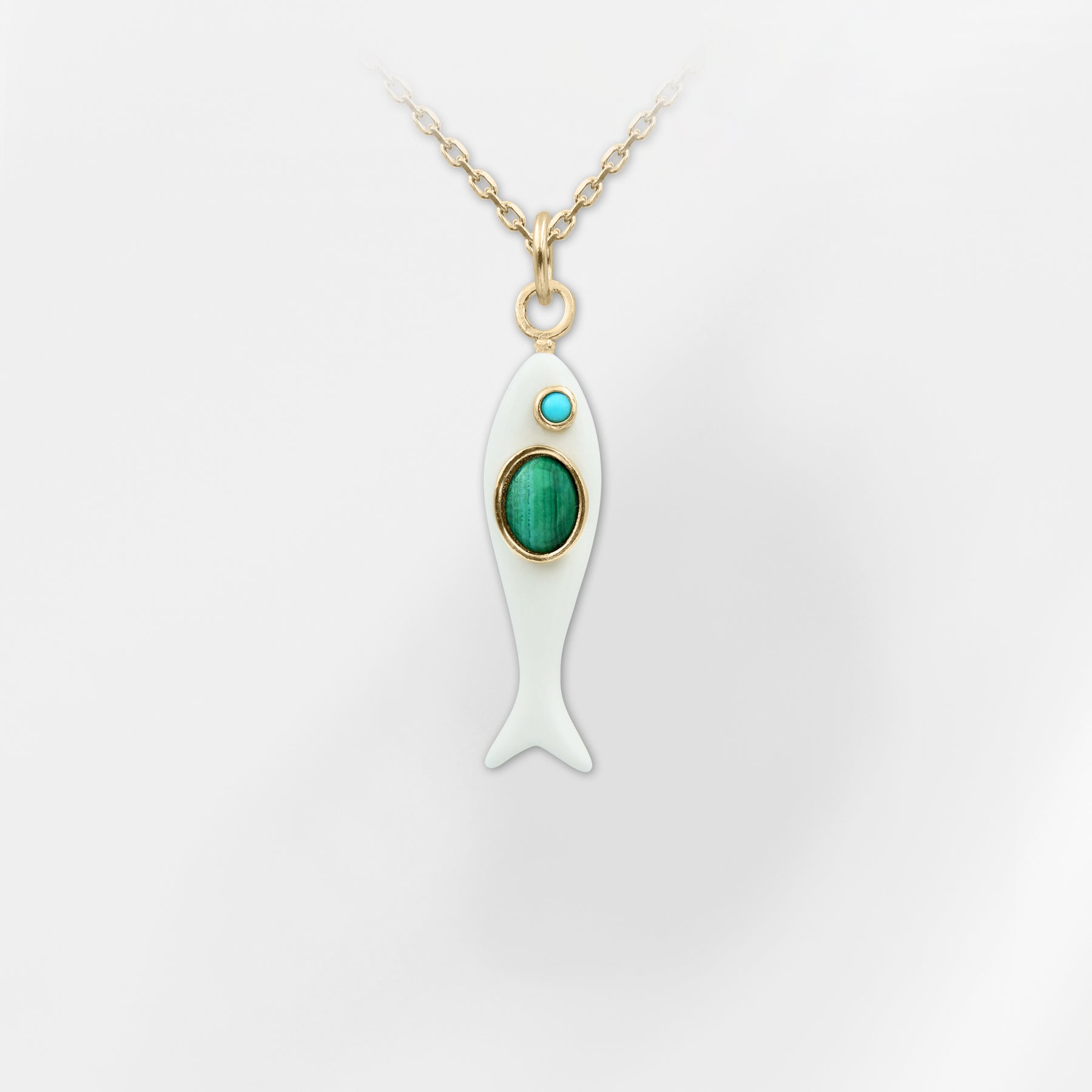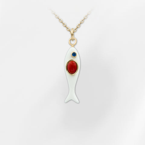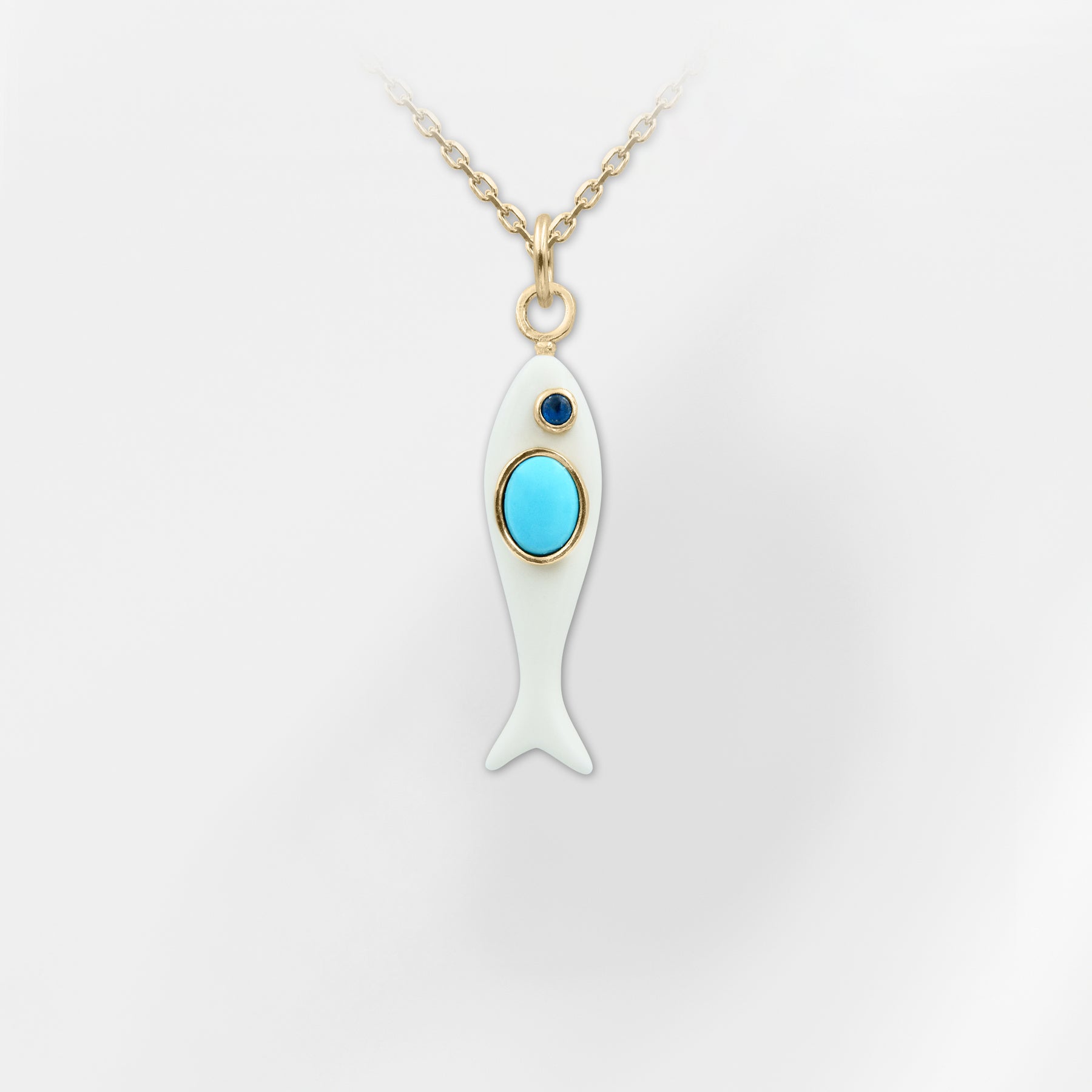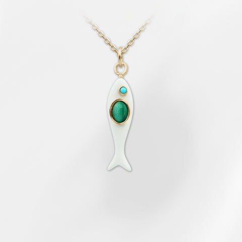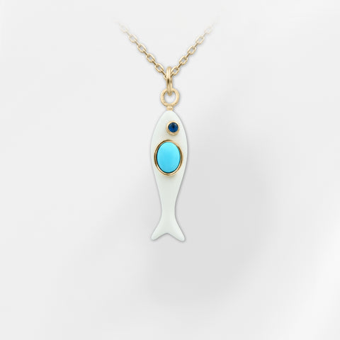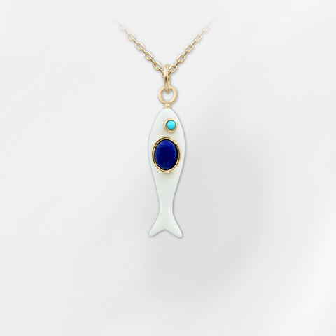 Fish pendant inspired by the colors of Greece and the Mediterranean. Designed to be worn alone or layered. A limited edition summer piece.