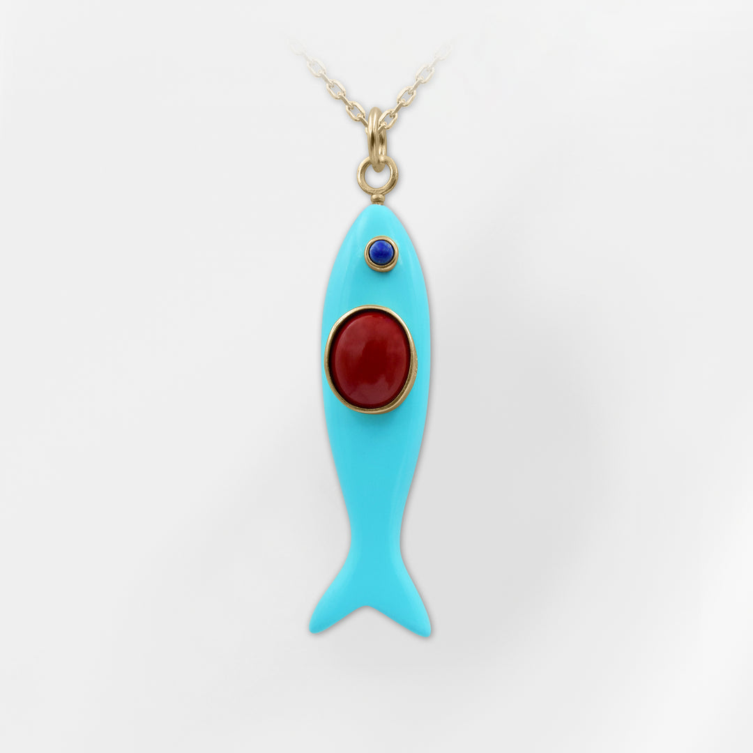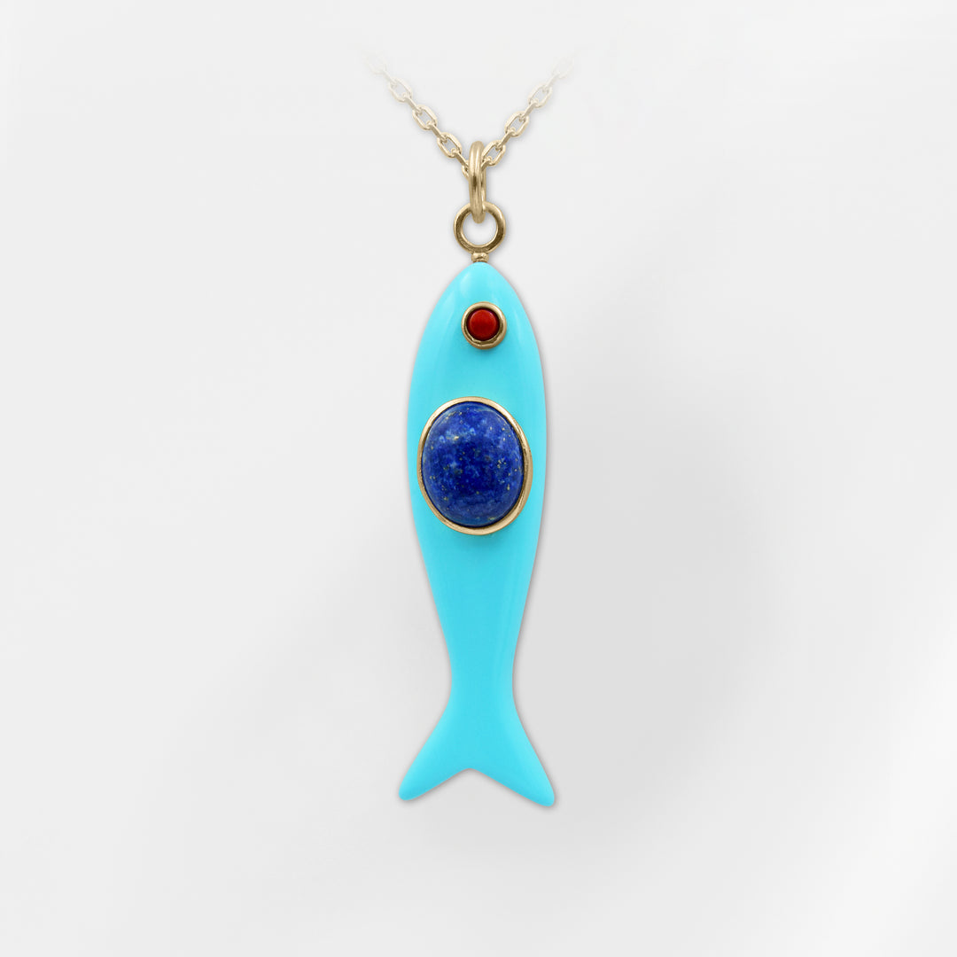 Nerida – Turquoise Fish Pendant with Lapis Lazuli and Red Coral