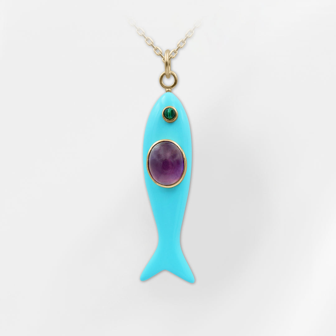 Nerida – Turquoise Fish Pendant with Amethyst and Malchite