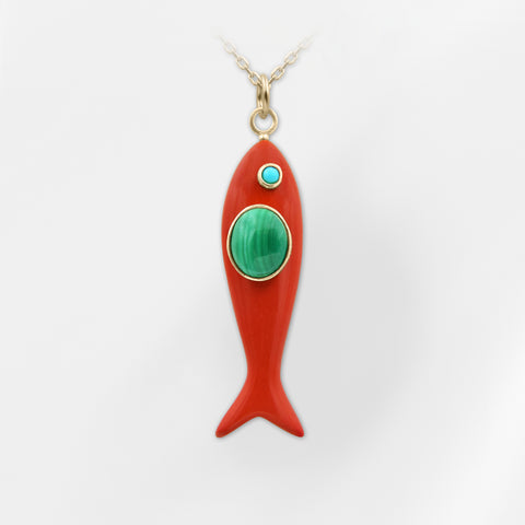 Statement fish necklace in red with a bold shape and strong presence. Comes with an adjustable magnetic choker cord. Available in different color combinations.